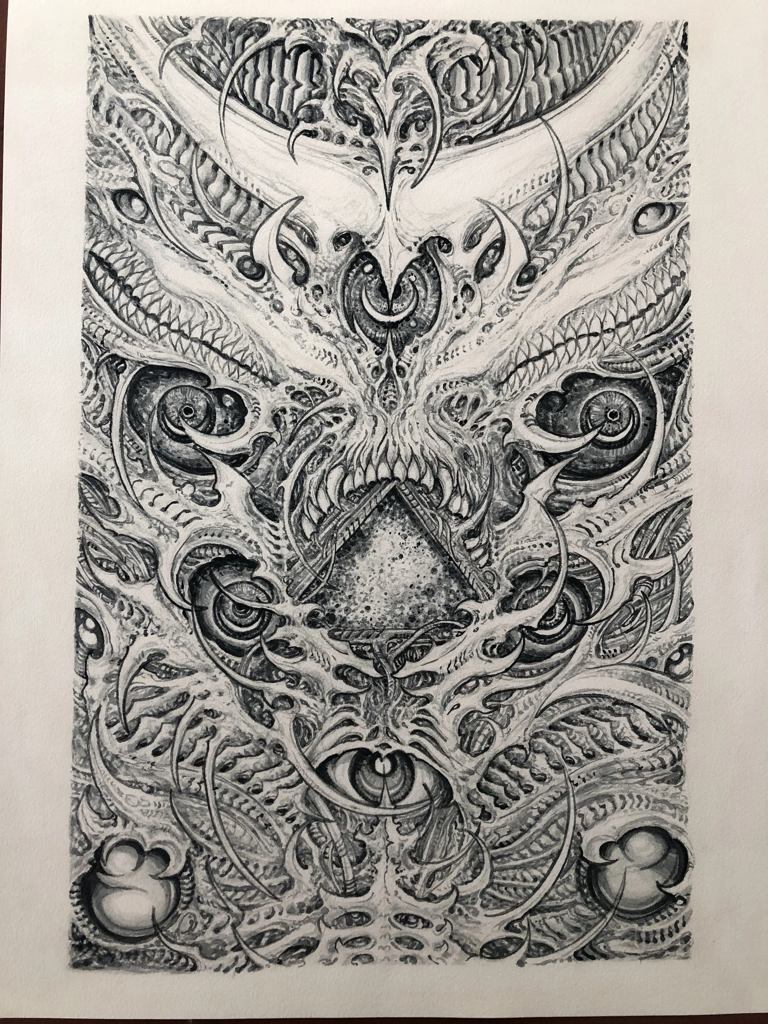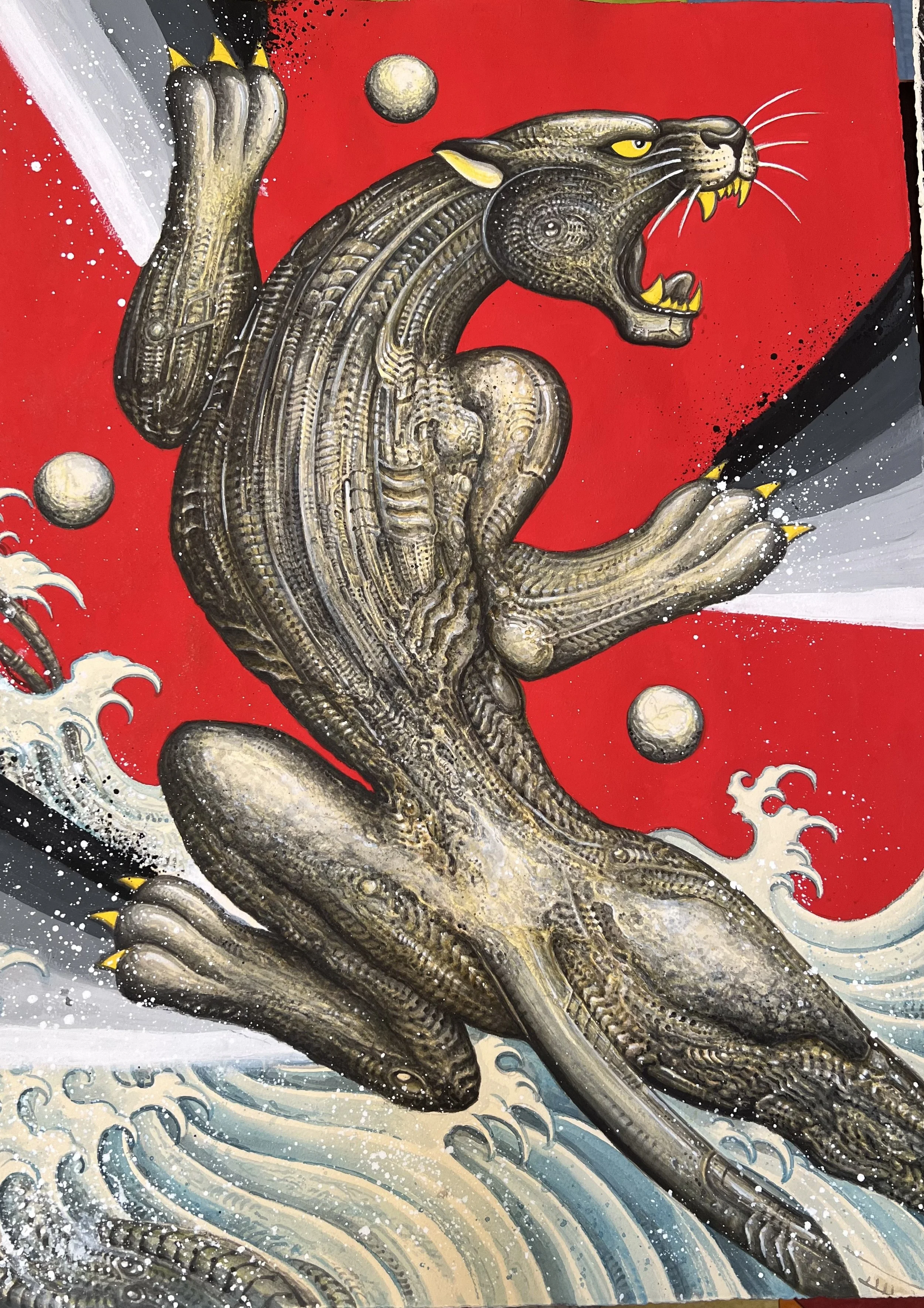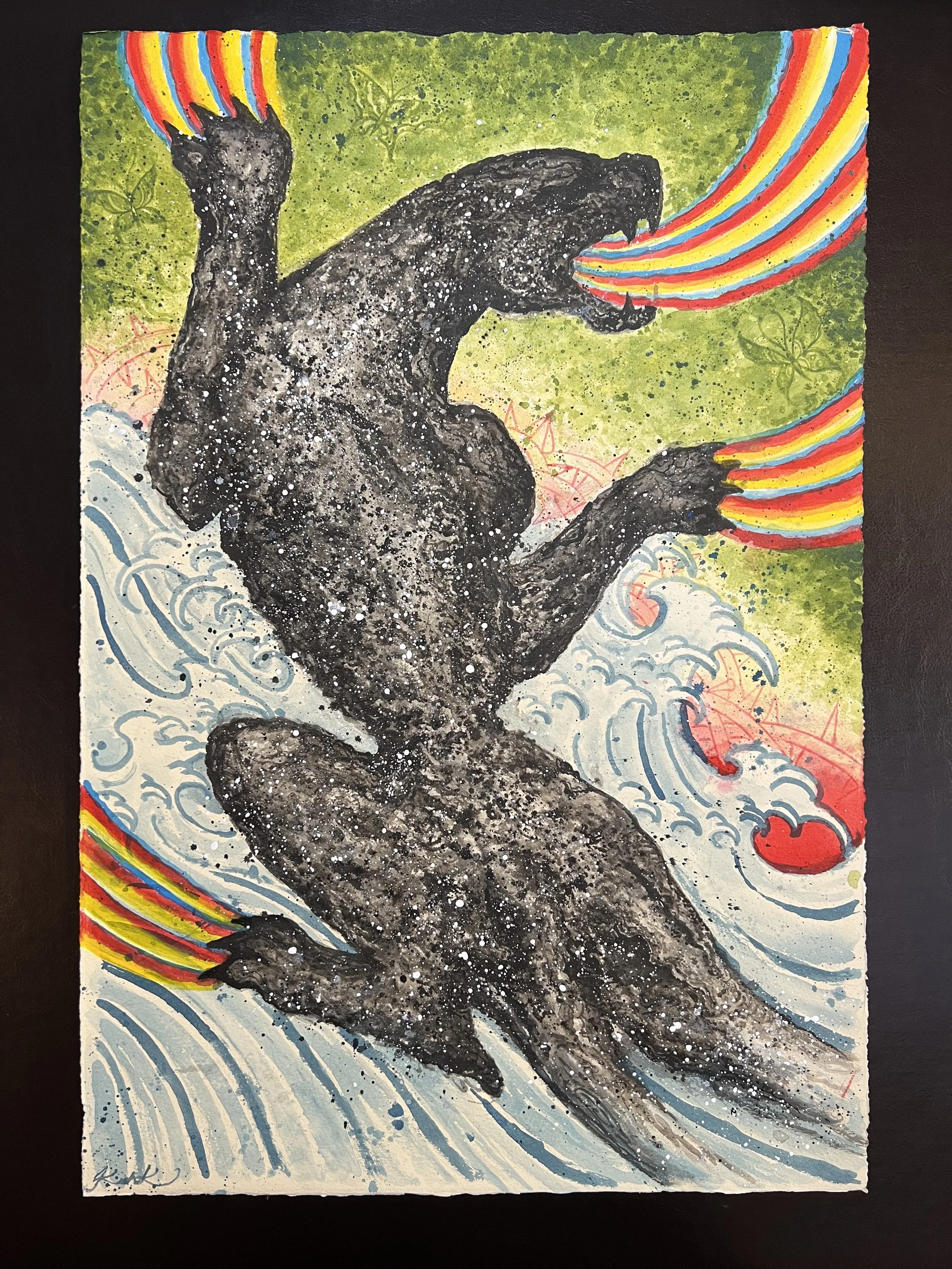 A cosmic-style illustration of a black dinosaur breathing rainbow-colored fire over turbulent blue water with green and yellow background, featuring abstract designs and splashes of white paint.