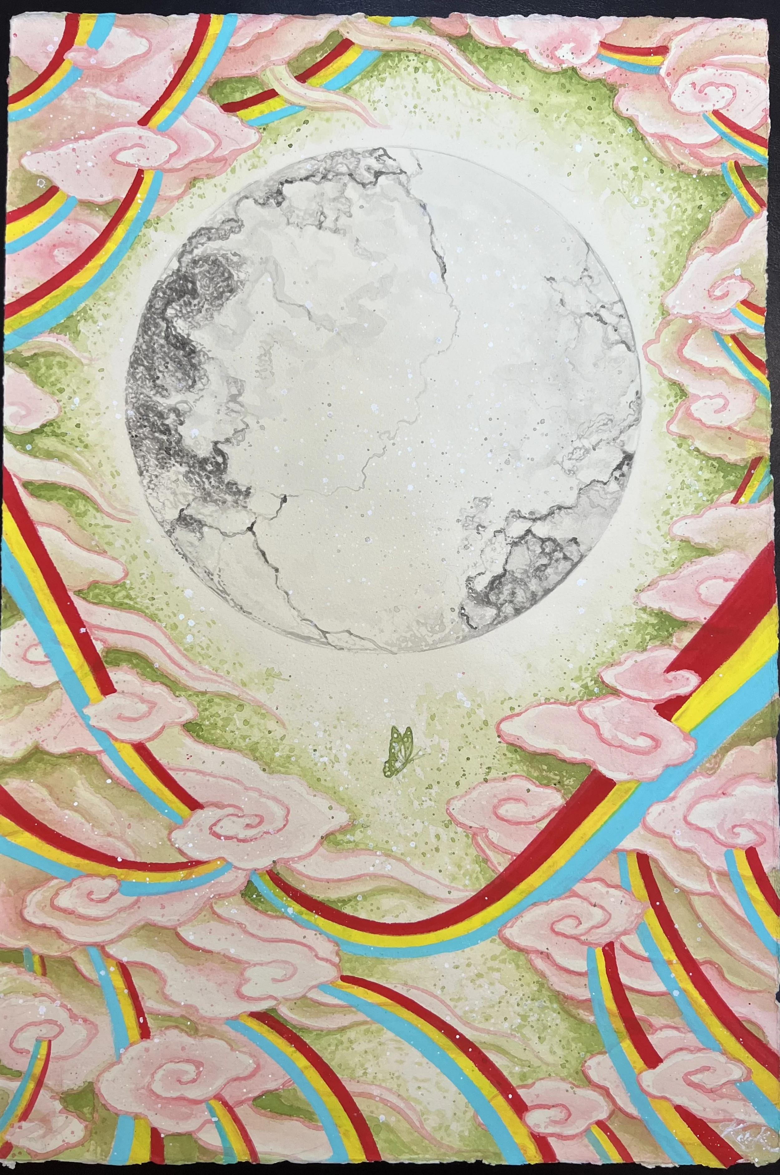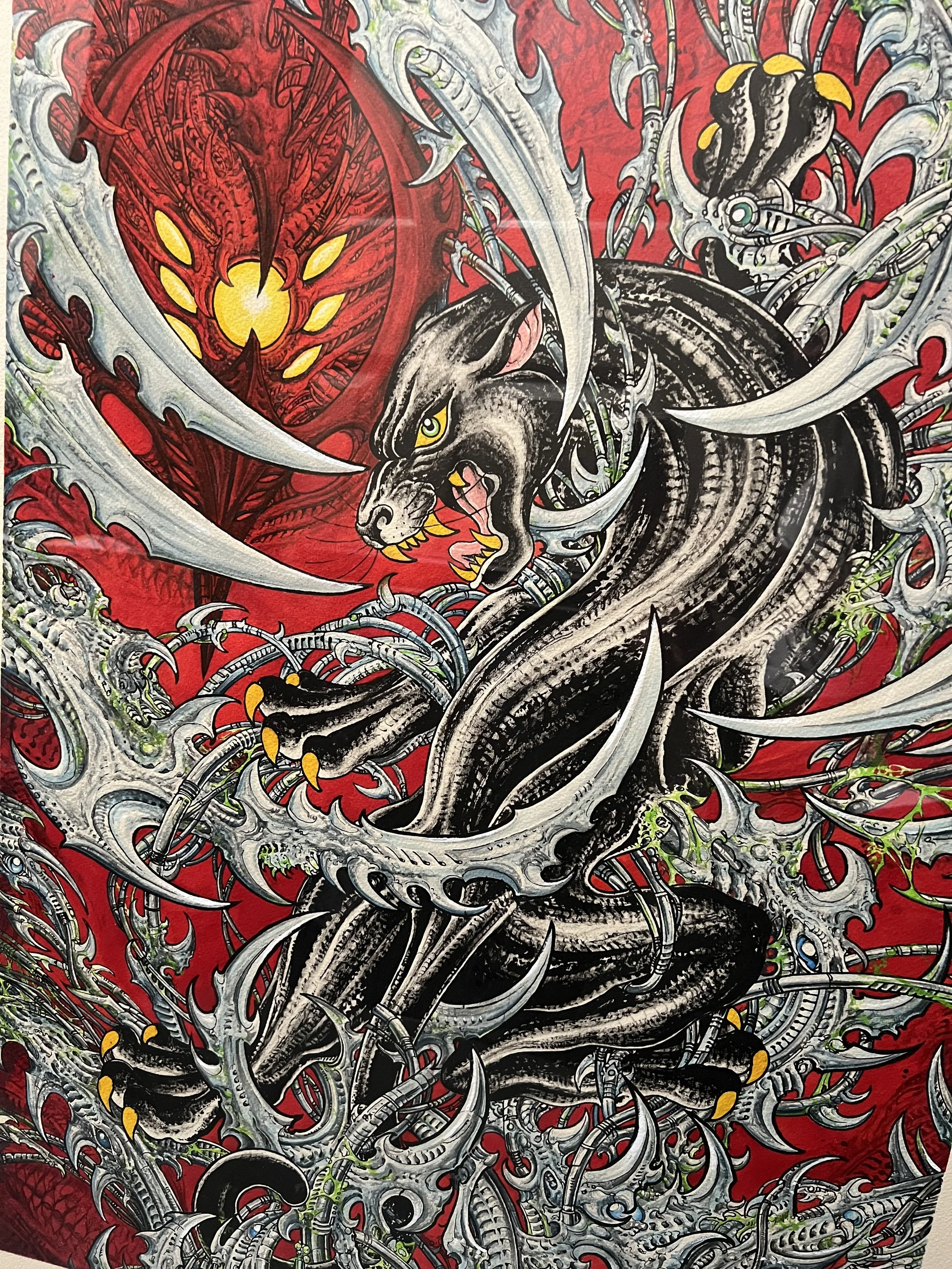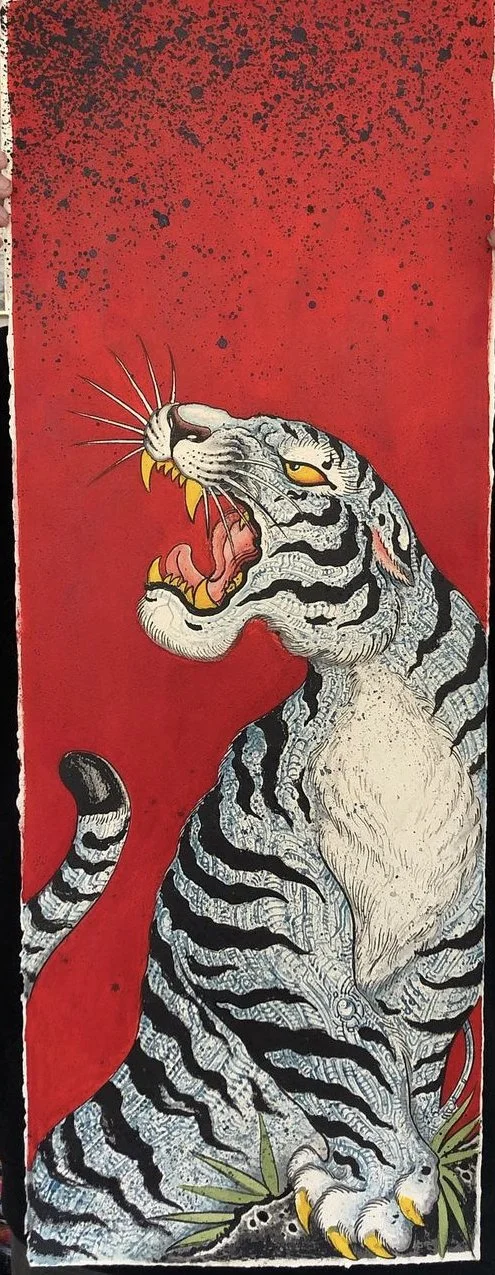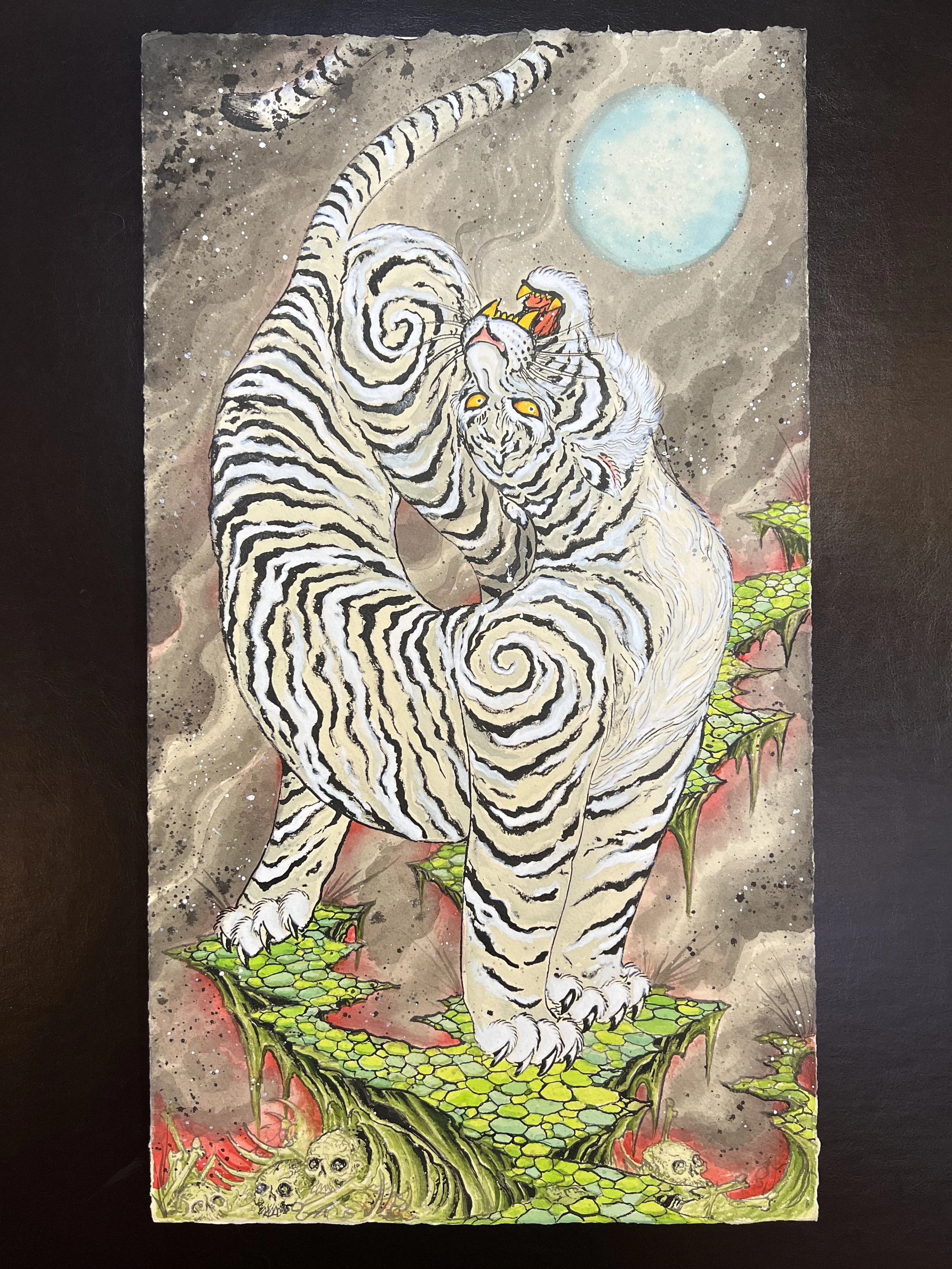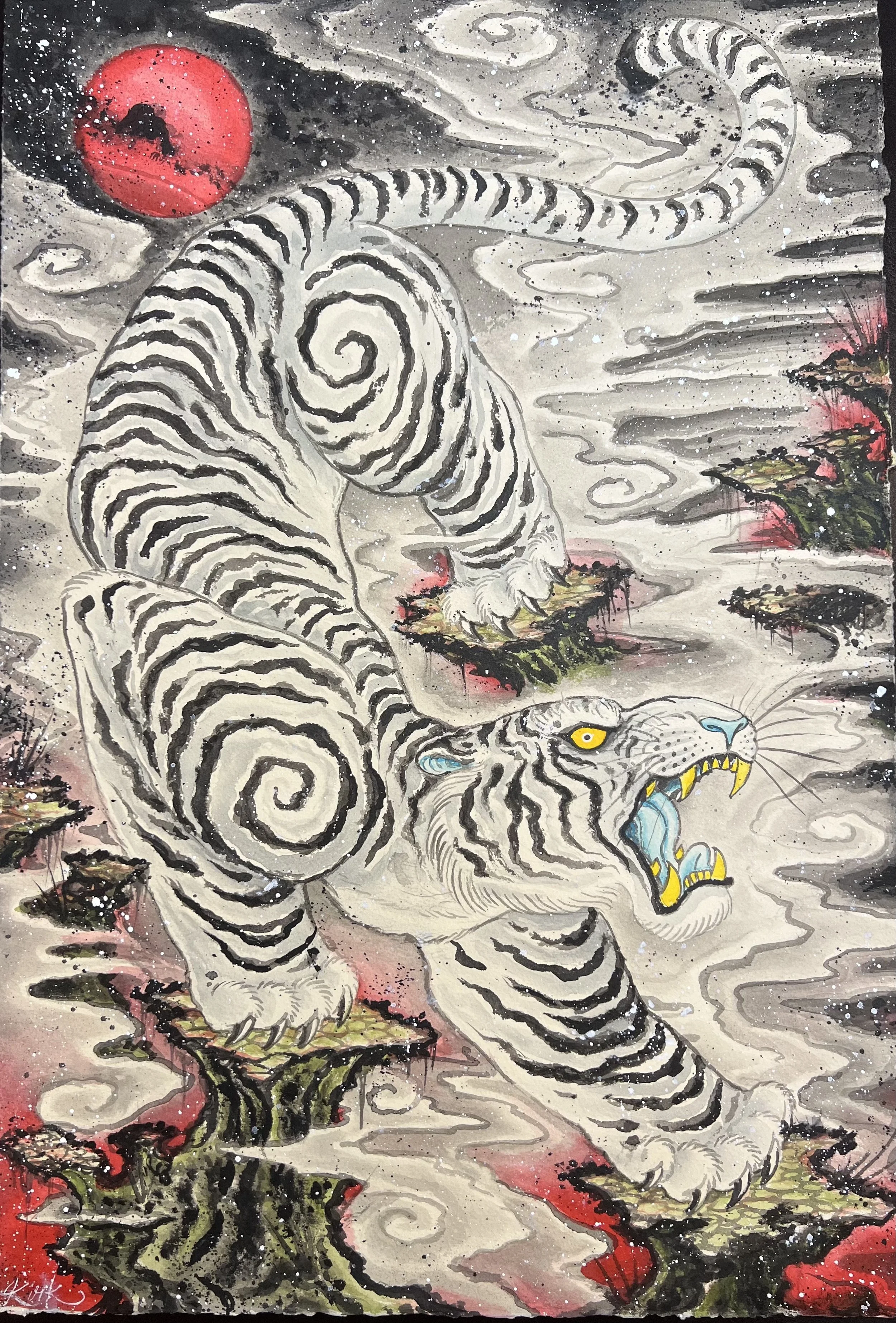 A stylized painting of a fierce white tiger with black stripes, snarling with yellow eyes and blue tongue, climbing rocky terrain against a swirling cloudy sky and red moon background.