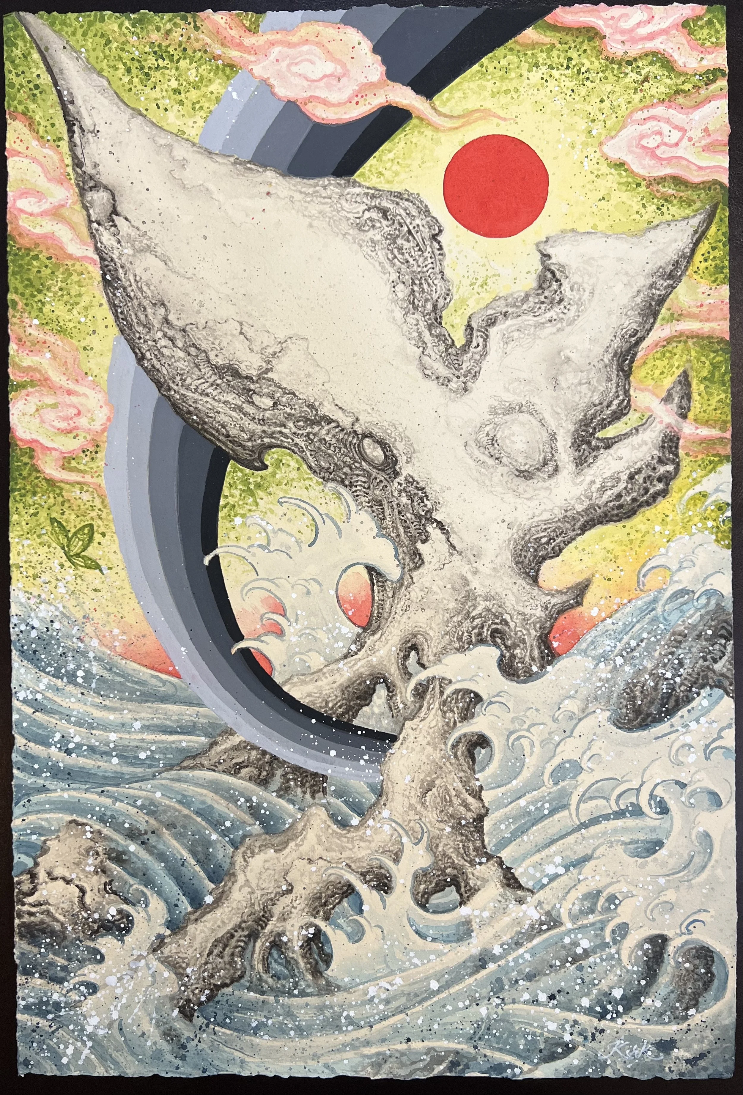 A surreal painting of a whale made of rock partially submerged in turbulent ocean waves, with colorful clouds, a bright red sun, and a rainbow in the background.
